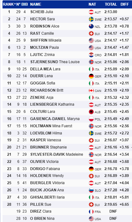 Ce sera finalement l’Autrichienne Julia Scheib qui montera sur la plus haute marche du podium avec un temps de 2 mon 13 sec 00. La Suédoise et championne olympique Sara Hector et la Néo-Zélandaise Alice Robinson complètent le podium. Un deuxième en autant de jours pour la skieuse de Nouvelle-Zélande. La seule Canadienne Britt Richardson a terminé au 12e rang à 2 sec 19 de la meneuse.