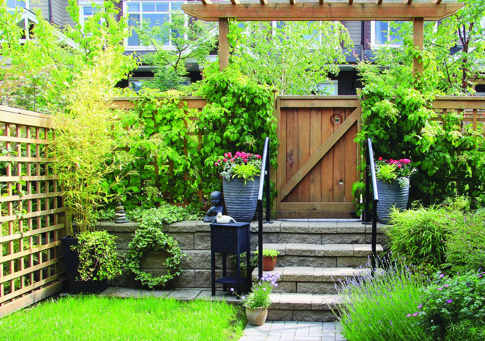 Tirez avantage des propriétés de végétaux tels que les graminées et les plantes grimpantes — qui croissent en outre rapidement et nécessitent peu d’entretien — pour concevoir un jardin tout en hauteur. Clématites, chèvrefeuilles et rosiers sarmenteux, par exemple, enjoliveront la terrasse de leurs fleurs colorées, alors que les feuillages denses des vignes, des lierres et du houblon, notamment, formeront un magnifique écran de verdure. Murs, clôtures, treillis, tonnelles… ce ne sont pas les structures qui manquent pour y faire grimper vos plantes!